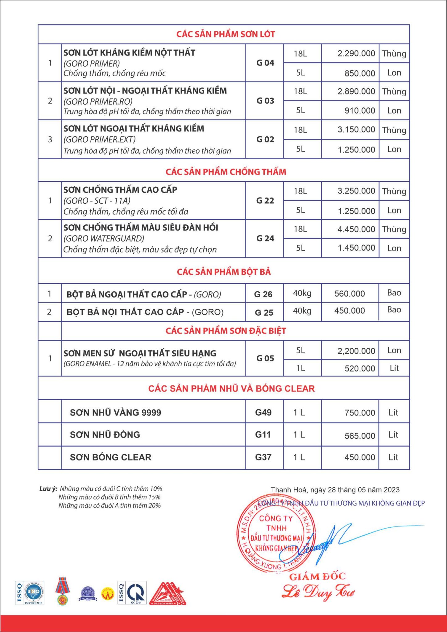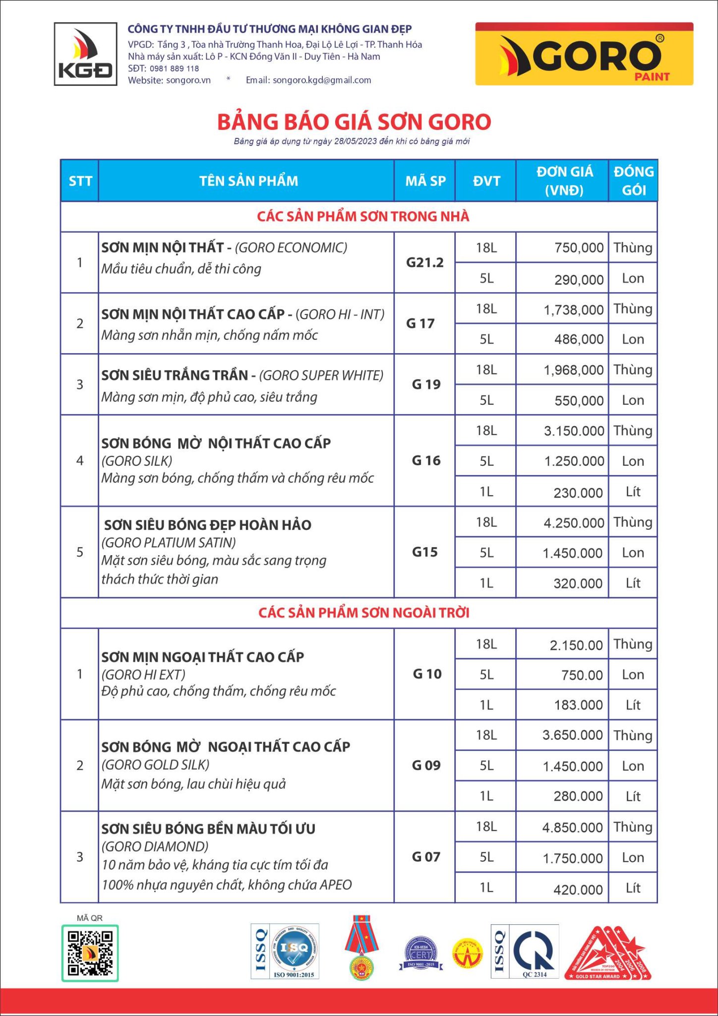 Kính gửi qúy đối tác khách hàng Bảng giá Sơn Goro như sau